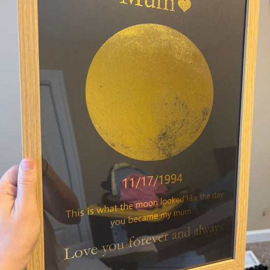 El marco personalizado "Fase de la Luna" es un regalo único que captura el instante mágico de la fase lunar en una fecha precisa, ya sea un nacimiento, un cumpleaños o cualquier otra ocasión especial.